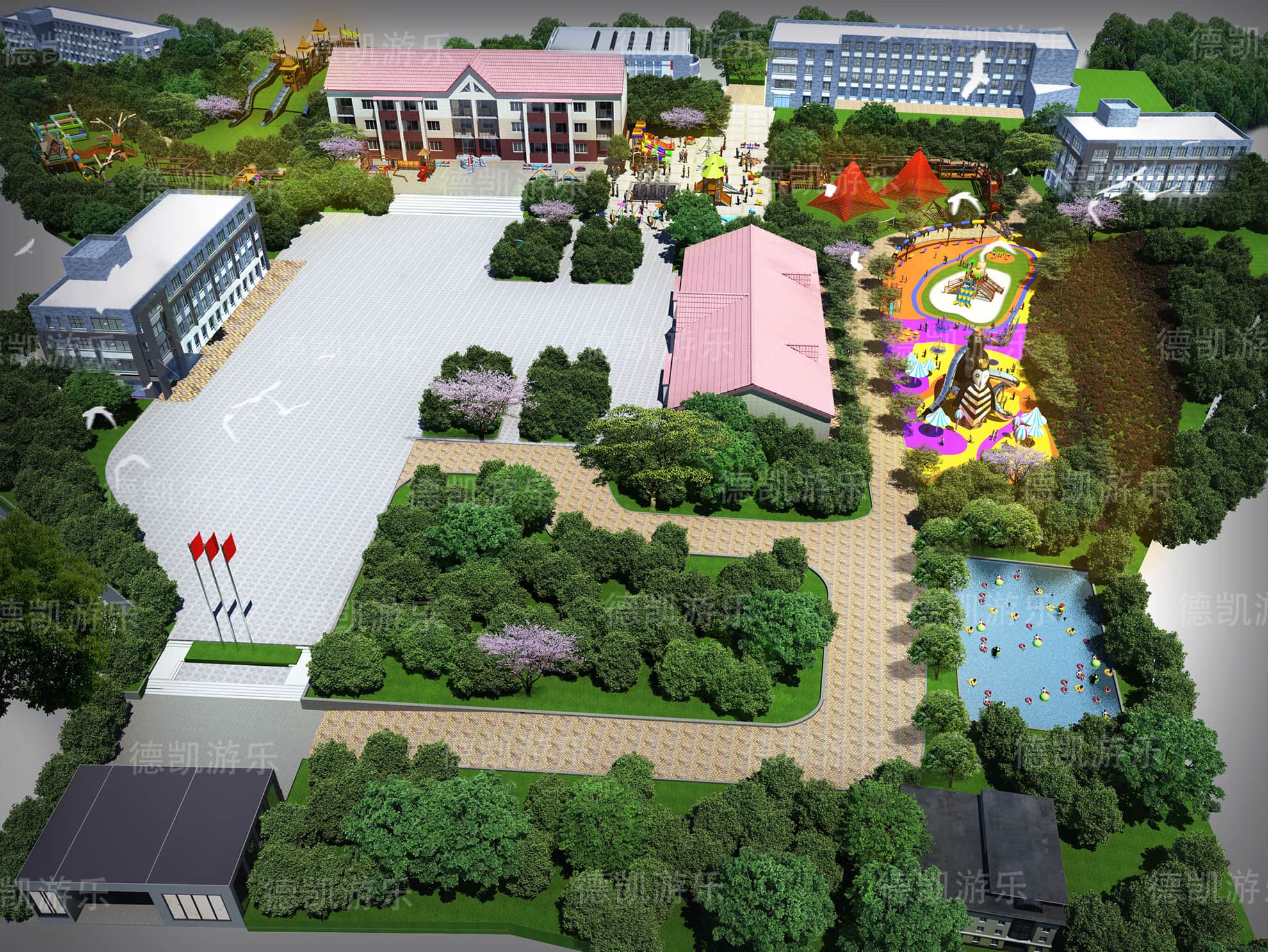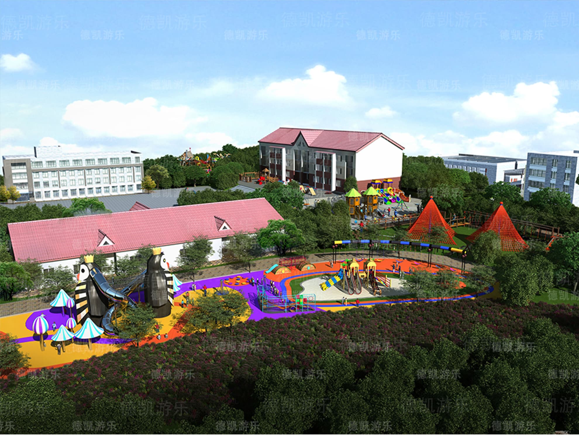 對于這個園子而言,它是屬于學校配套了,它里面的設備對孩子們的年齡段就沒有那么大了,年齡段應該在2-15為主,可以包括幼兒園、小學、初中。在下課之后,游樂區域會擠滿了孩子們的身影,他們在這里追逐、打鬧,玩耍,爭分奪秒地過著下課時間。在這個效果圖里面,完全可以看見企鵝滑梯、組合滑梯、城堡滑梯、勇攀高峰等比較大型的游樂設備,從周圍環境可以清晰的看見許多的教學樓,因此這個學校的孩子數量就會相對來說比較的多,這些游樂設備能夠得到很好的利用。