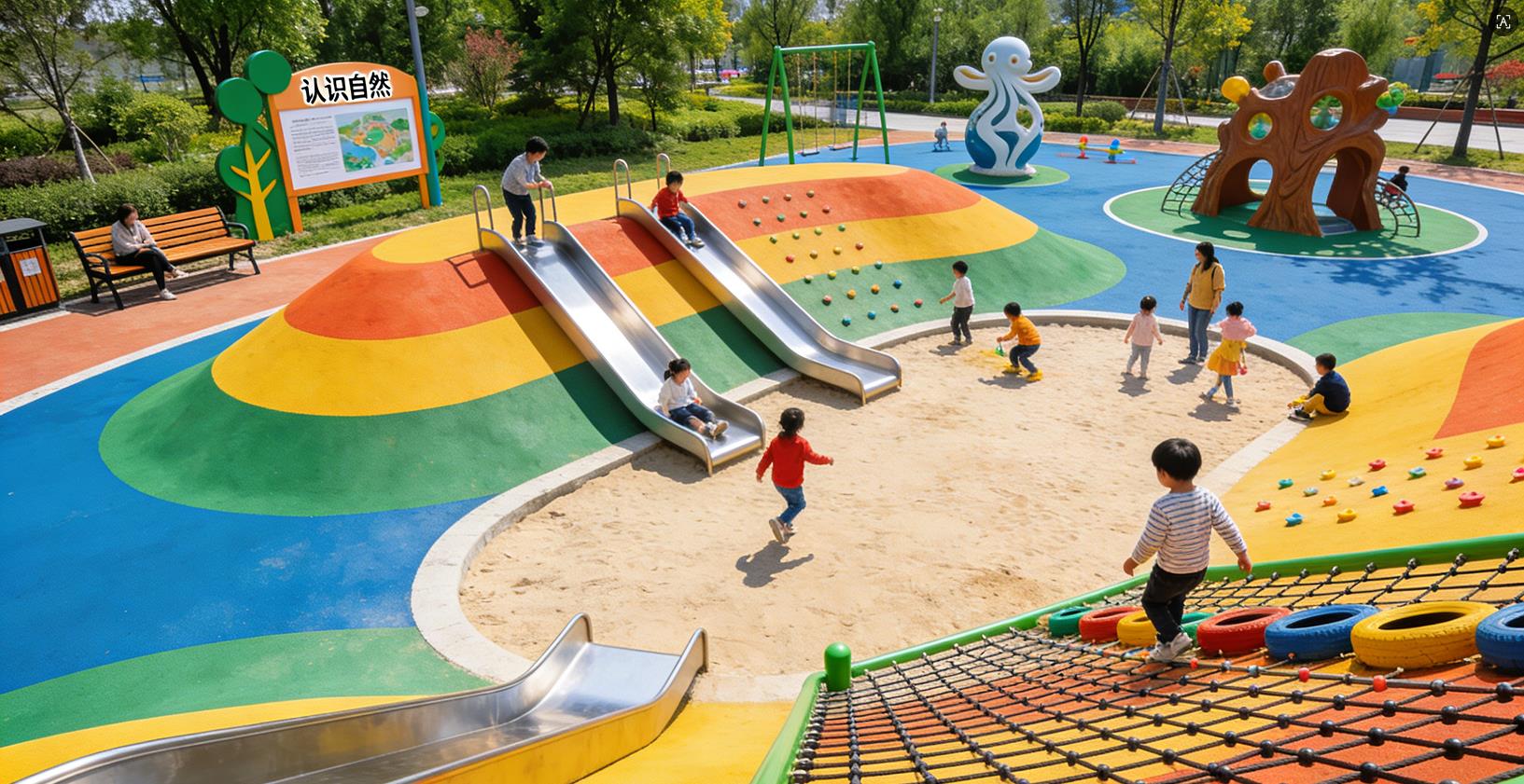 地形設計需同步融入安全防護措施,地面采用塑膠材質鋪裝,為兒童活動提供可靠安全保障。針對低齡兒童打造的攀爬區域,考慮到幼兒危險感知與自我防護能力較弱,需在活動場地周邊設置監護人休憩交流區,方便家長就近看護。
