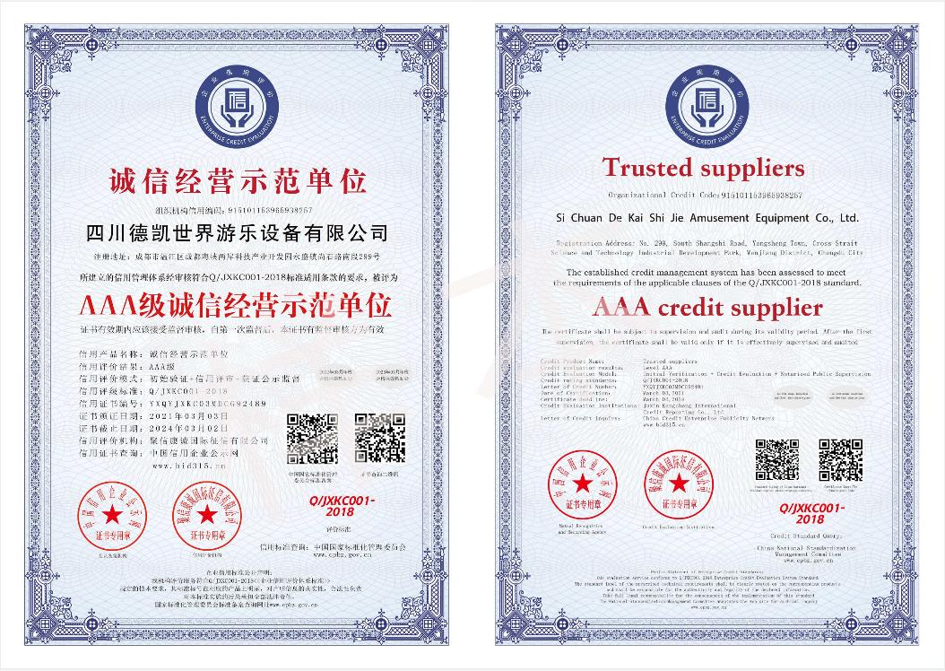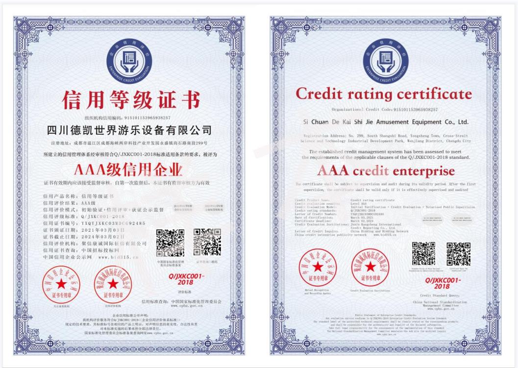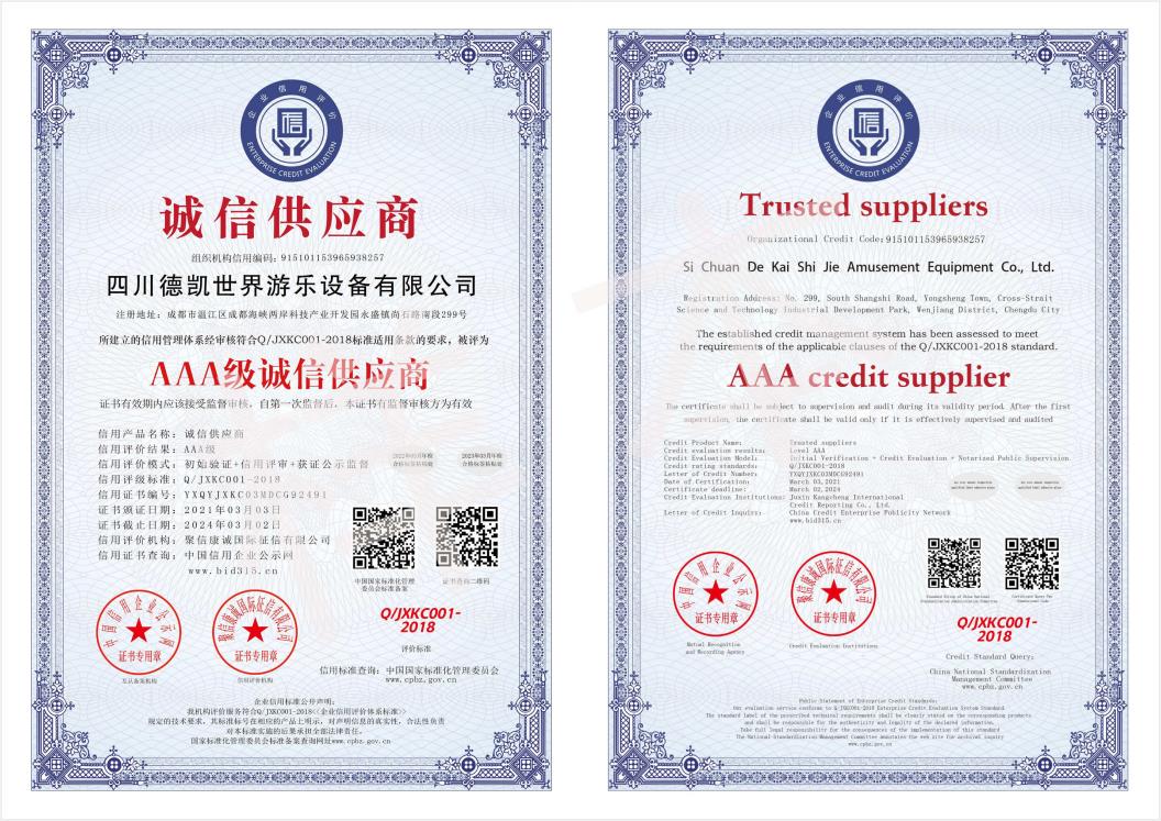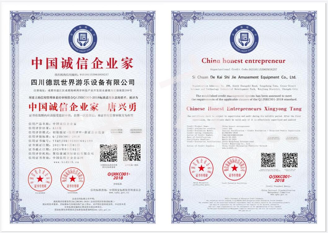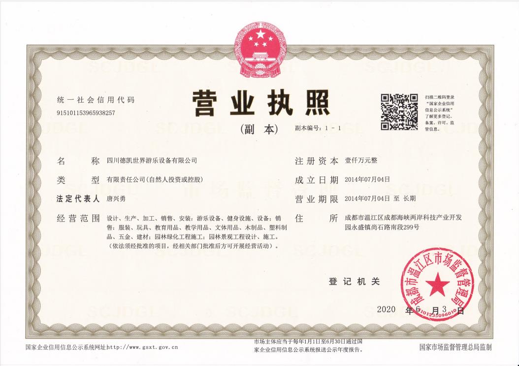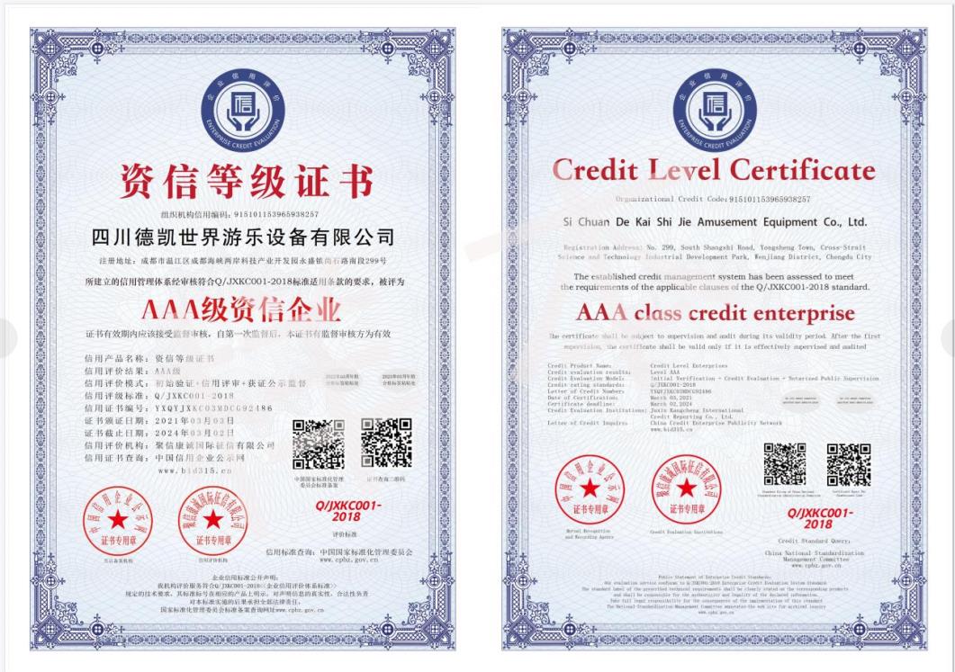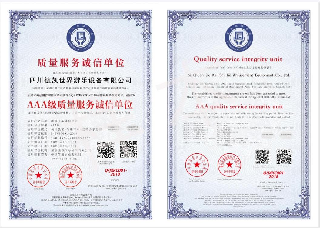 四川德凱世界游樂設備有限公司是一家集研發、生產、銷售、服務于一體的兒童游樂設備廠家,并衍生打造兒童游樂園,形成了從項目調研、整體規劃設計、設備研發生產、施工安裝、售后運營投資、項目幫扶合作一體化的全產業鏈布局。德凱游樂一直奉行“誠信,質量,安全”的經營理念,不斷創新產品和技術提升,服務全國客戶超5000家以上,先后孵化100~1000畝以上多個大型游樂園項目方案落地,實戰經驗豐富,深受客戶認可和好評。